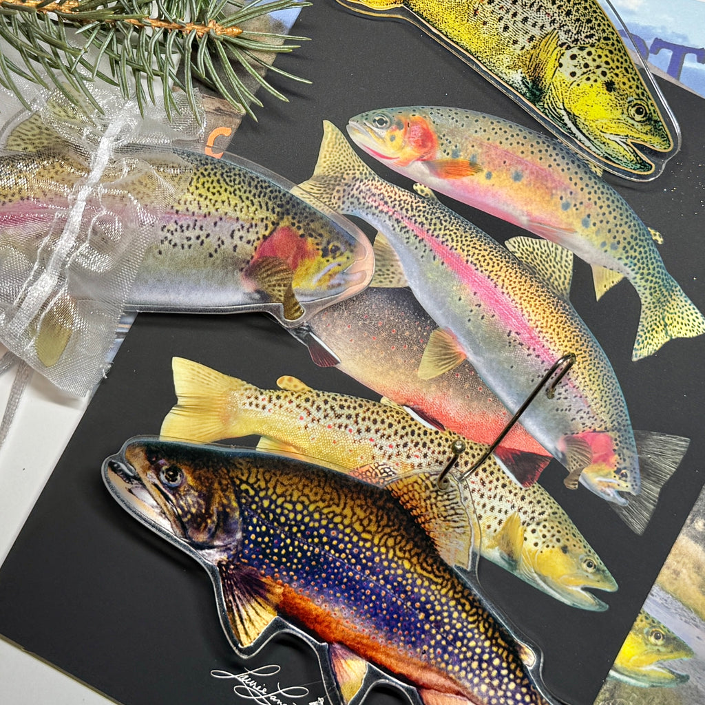 Discover Trout & Company’s exclusive Collectible Trout Ornaments and prints, featuring real trout photographed in the water with a medium-format Hasselblad film camera by fly fishing artist and conservationist Laurie Lane. The trout are printed on premium crystal-clear plexiglass and shimmers with lifelike detail and depth, allowing light to shine through for a stunning effect.