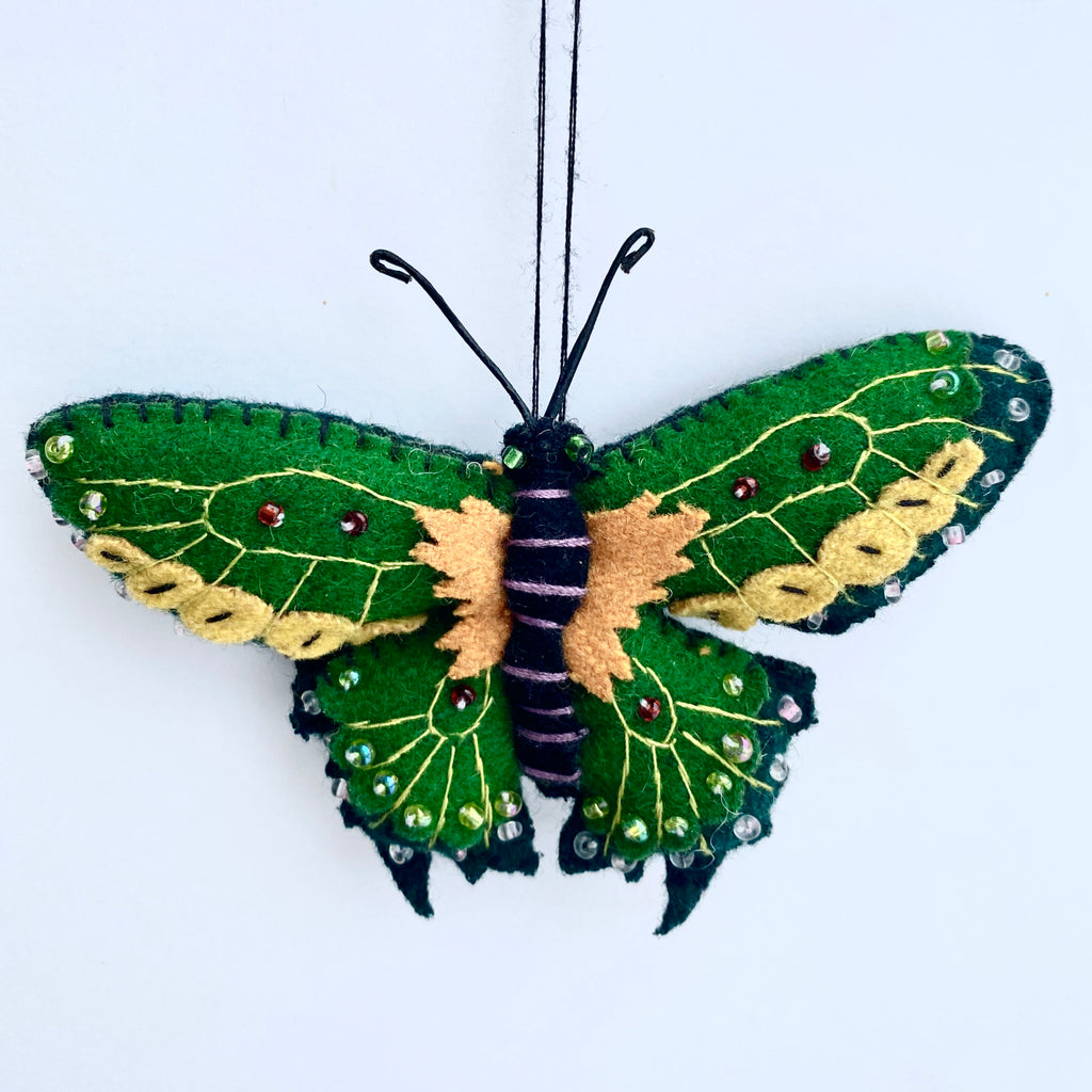 These are the sweetest hand-sewn, felted, and beaded trout, salmon, bass, and butterflies, perfect for finishing a package or tree. We like to keep ours hanging around all year.